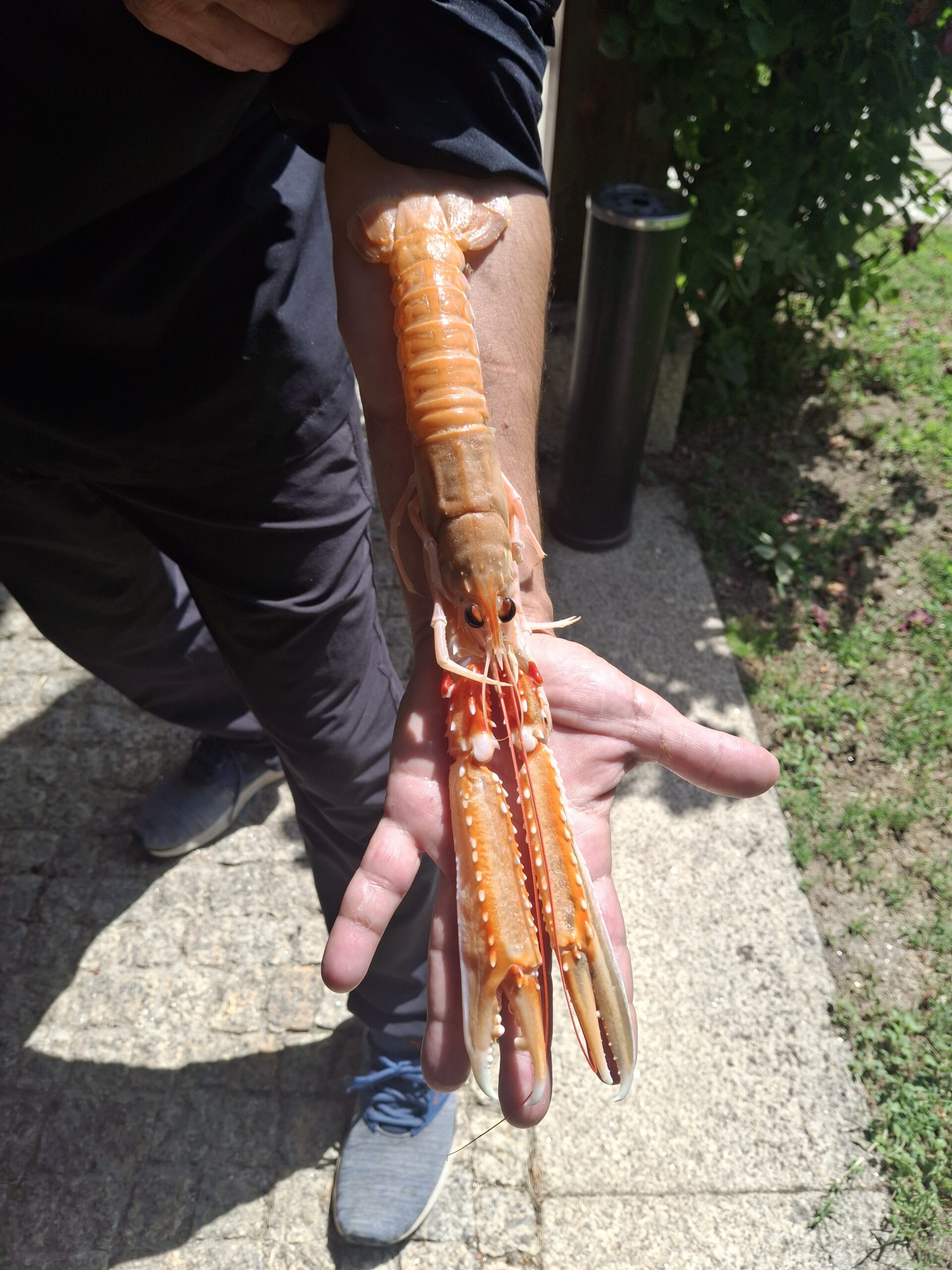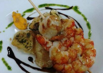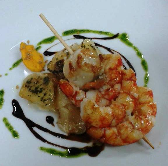- BROCHETA DE GAMBONES GRANDES A LA PLANCHA CON PATATAS A LA CREMA