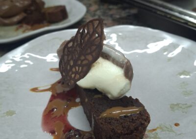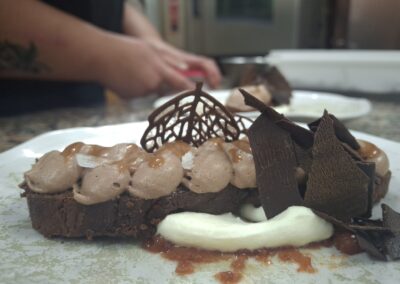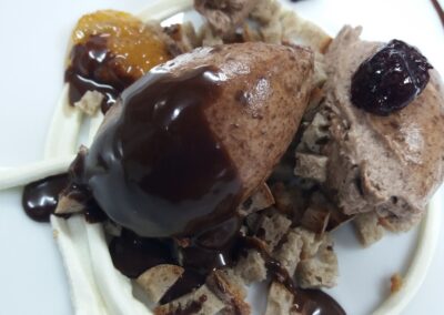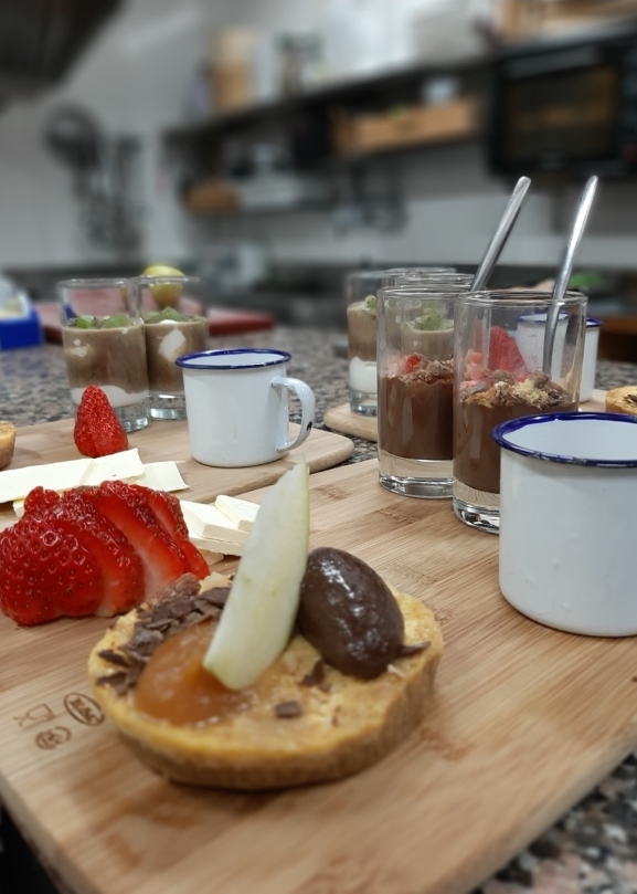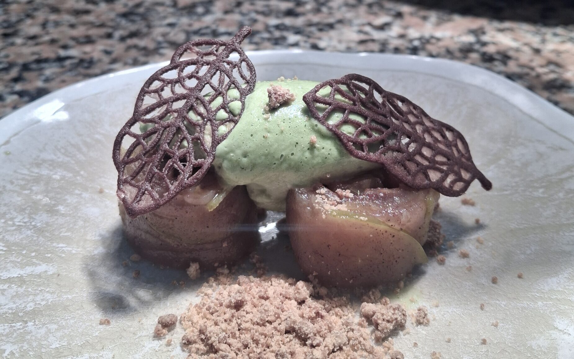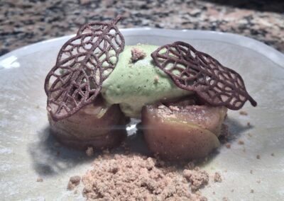 | • Manzana caramelizada con crema de té matcha, frutos secos y crumble casero de canela. Trufas caseras | |