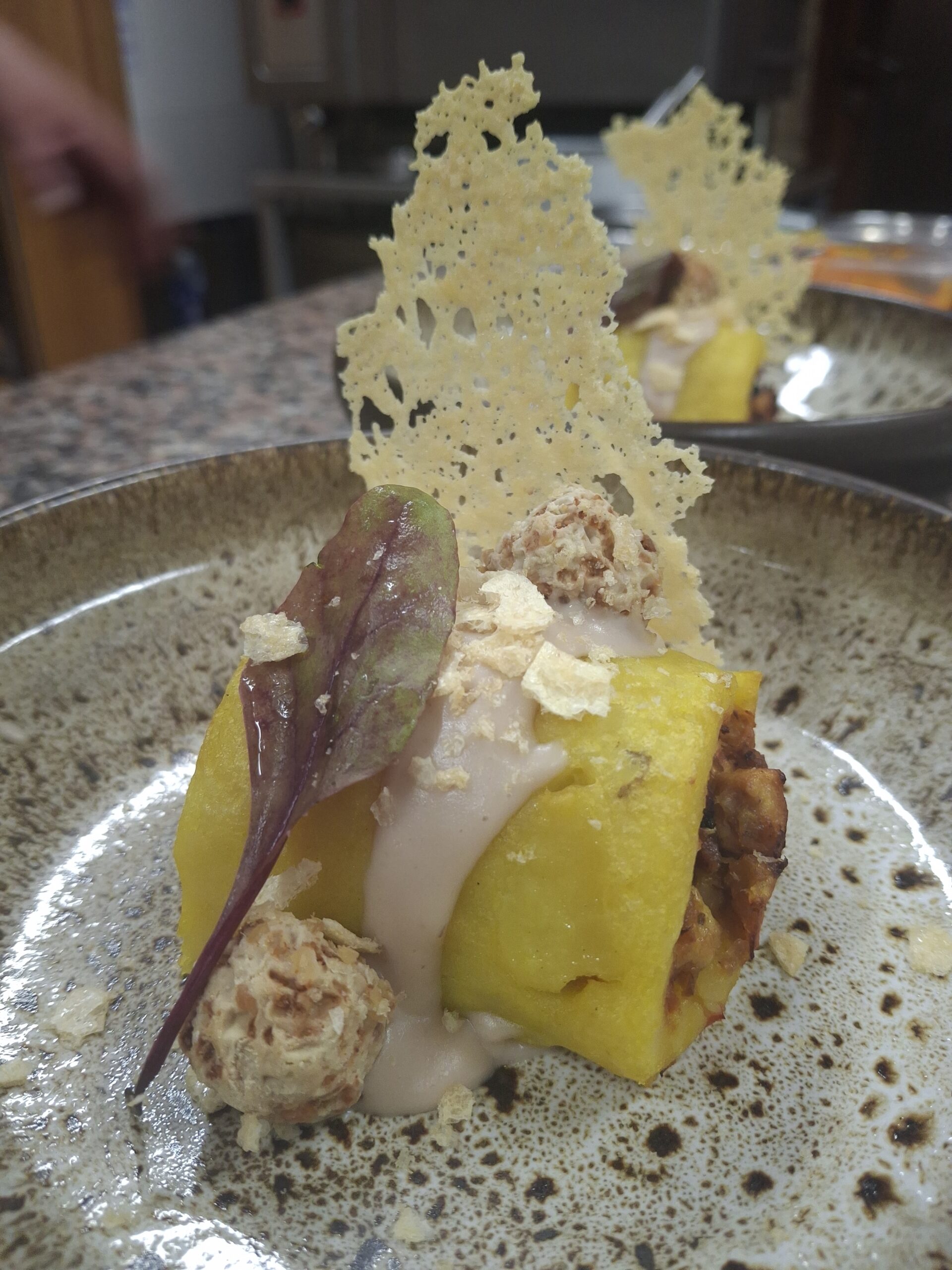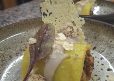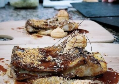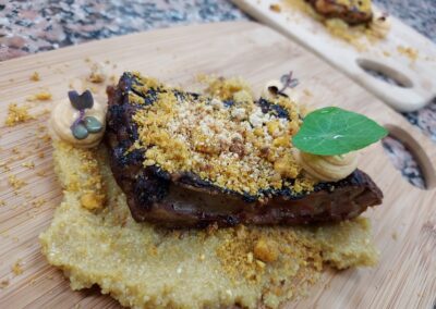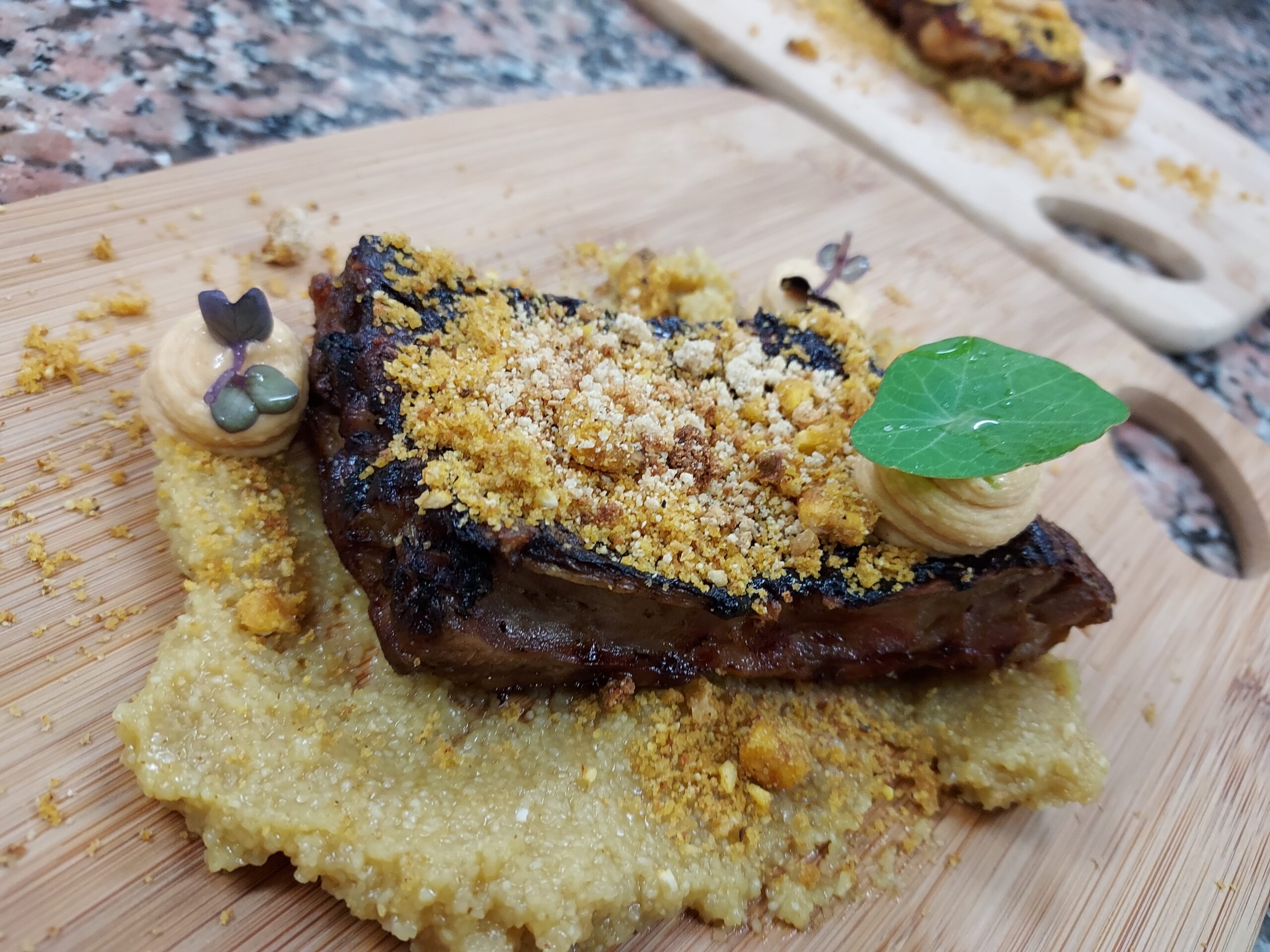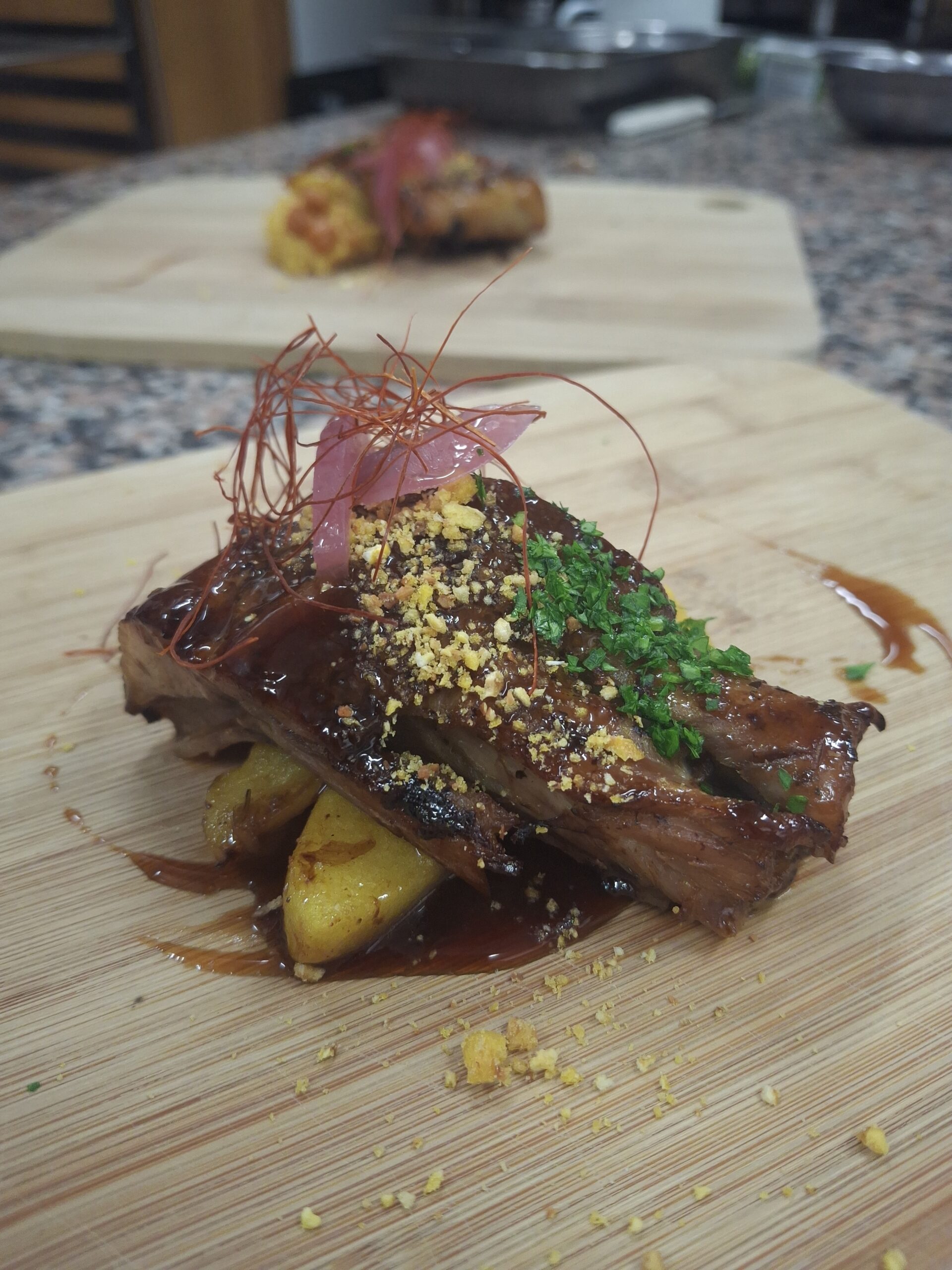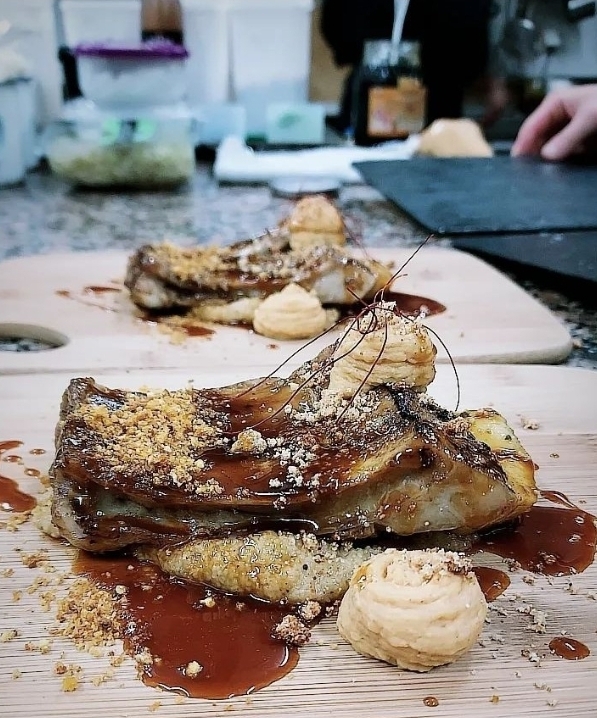 - COSTILLA DE CERDO DESHUESADA CON SALSA DE OSTRAS, MANZANA, SÉMOLA DE TRIGO Y GRANOLA DE KIKOS (si no tomas cerdo te damos otra opción de carne, avísanos en tu reserva)