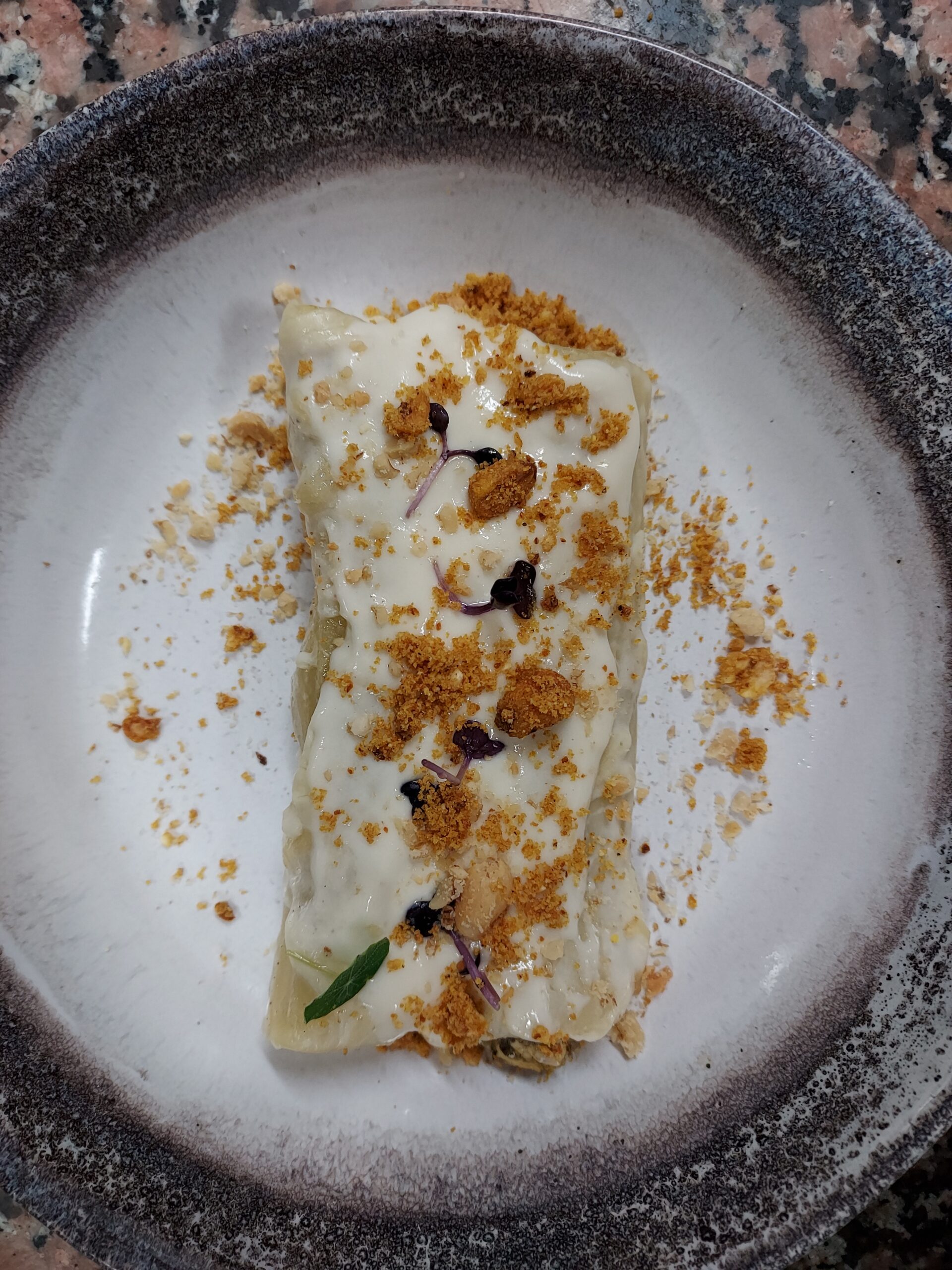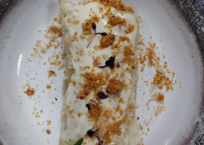 - ROL DE PASTA FILO RELLENO DE POLLO, ESPINACAS, FRUTOS SECOS Y CREMA DE YOGUR GRIEGO