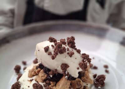 - CREMOSO DE QUESO CON ARÁNDANOS DE GALICIA, BIZCOCHO CASERO Y CHOCOLATE CALIENTE