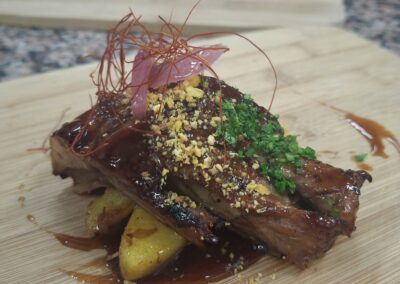 | • Costilla de cerdo deshuesada con salsa de ostras, polenta y quicos | |
