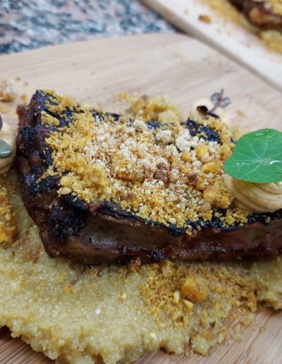 – Costilla de cerdo deshuesada con salsa de ostras, sémola de trigo y granola de kikos (opción sin cerdo consultar)